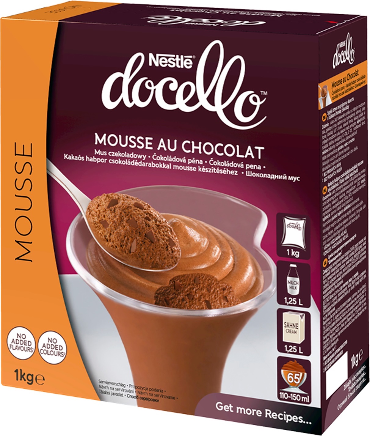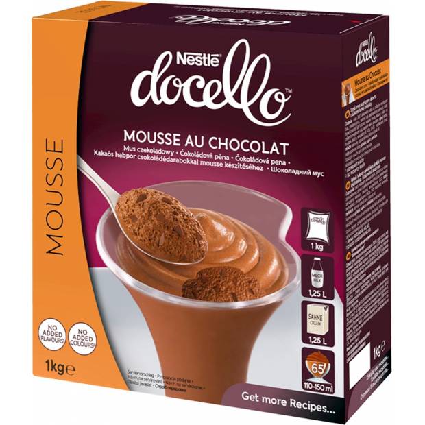 Sypká směs pro přípravu dezertu s kousky hořké čokolády. Dávkování: 1 kg čokoládové pěny, 1,25 l mléka, 1,25 l šlehačky nebo 1 kg čokoládové pěny, 2,5 l mléka Použití: Do vysoké nádoby nalijte studené polotučné mléko a studenou smetanu ke šlehání (nebo pouze studené polotučné mléko). Přidejte směs a metličkou vymíchejte dohladka. Poté šlehejte mixérem 1/2 minuty při nízké a 5 minut při vysoké rychlosti. Doba šlehání závisí na výkonu mixéru. Porce rozlijte do forem a nechte ztuhnout v chladu po dobu nejméně 3 hodin. Složení: cukr, 24,6% kakaového prášku se sníženým obsahem tuku, glukózový sirup, rostlinné tuky (palmojádorvý, palmový), kousky hořké čokolády 6,8% (cukr, kakaová hmota, kakaový prášek se sníženým obsahem tuku, kakaové máslo, emulgátor sójový lecitin), hovězí želatina, emulgátory (E472a, E471), modifikovaný škrob, mléčné bílkoviny, rozpustná káva, jodidovaná sůl (jedlá sůl, jodičnan draselný) Nutriční hodnoty ve 100 g: energie 1858 kJ/443 kcal, tuky 16,4 g (z toho nasycené 13,8 g), sacharidy 58,2 g (z toho cukry 50,2 g), vláknina 8,9 g, bílkoviny 10,5 g, sůl 0,25 g