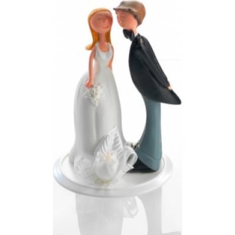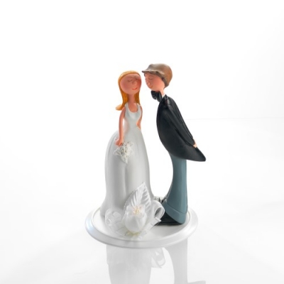 Nejedlá dekorace z polyresinu představuje svatební pár, tedy ženicha a nevěstu. Dekorace na svatební dort či jiný dezert. Lze tuto sošku umístit na patrový dort, na dorty atypického tvaru nebo kamkoliv jinam. Pro postavičku můžete vytvořit i podstavec z cukrové hmoty nebo marcipánu. Vyrobena je z resinu, což je velmi odolná pryskyřice. Soška je omyvatelná, snadno ji připravíte k dalšímu použití.