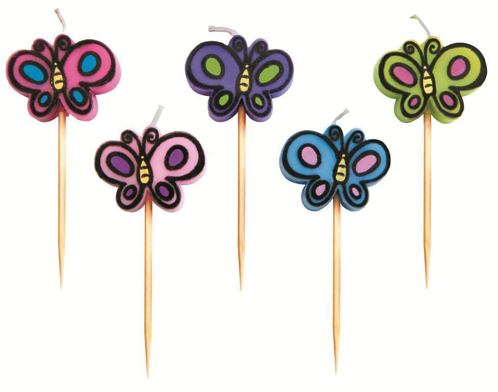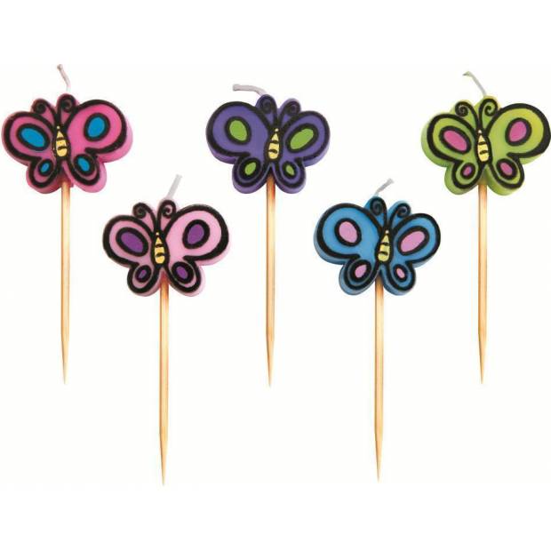 Využijte kreativních a nápaditých svíček, které ztělesňují motýla. Sada obsahující 5ks svíček rozdílného barevného vyhotovení. Každá svíčka je umístěna na pevné dřevěné špejli s hrotem, díky čemuž ji snadno zapíchnete do jakékoliv pochutiny. Ideální produkt pro narozeninovou párty.